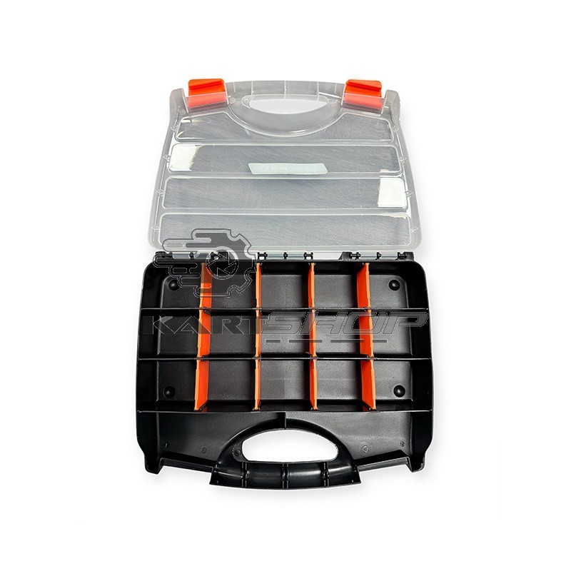 La boite de rangement KARTECH comprend 17 compartiments amovibles. Vous pourrez l'utiliser pour ranger vos pièces de réglages carbu, ainsi que votre visserie ou encore bien d'autres choses.